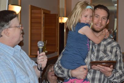 Don McLain KB8RAD presents the 2014 Ziegenbein Award to Dan Beuchert WX8MOJ with daughter Abigail at the 2015 Ladies Night Banquet on May 8, 2015.